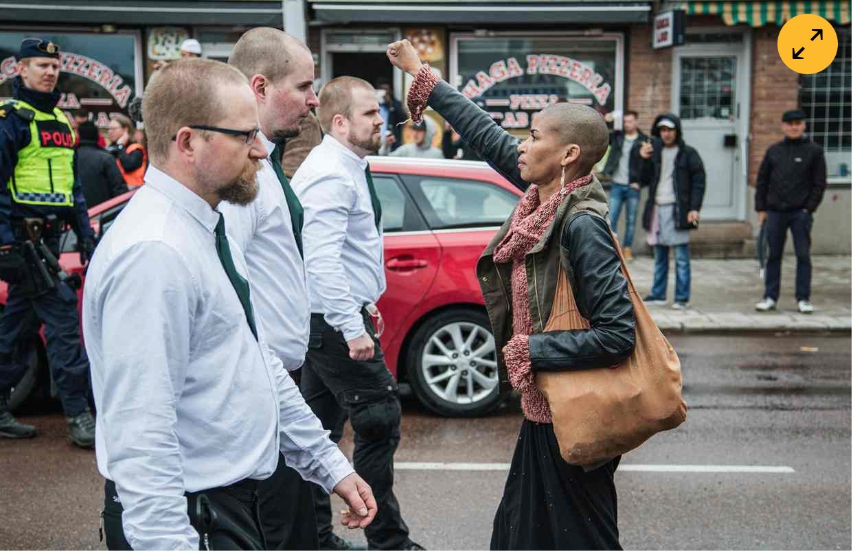 Tess Asplund, uma mulher negra de 42 anos, viu uma passeata que promovia o Movimento de Resistência Nórdico acontecer no centro de sua cidade, Borlänge (Suécia). E ela não pensou duas vezes ao se colocar no meio dos extremistas.